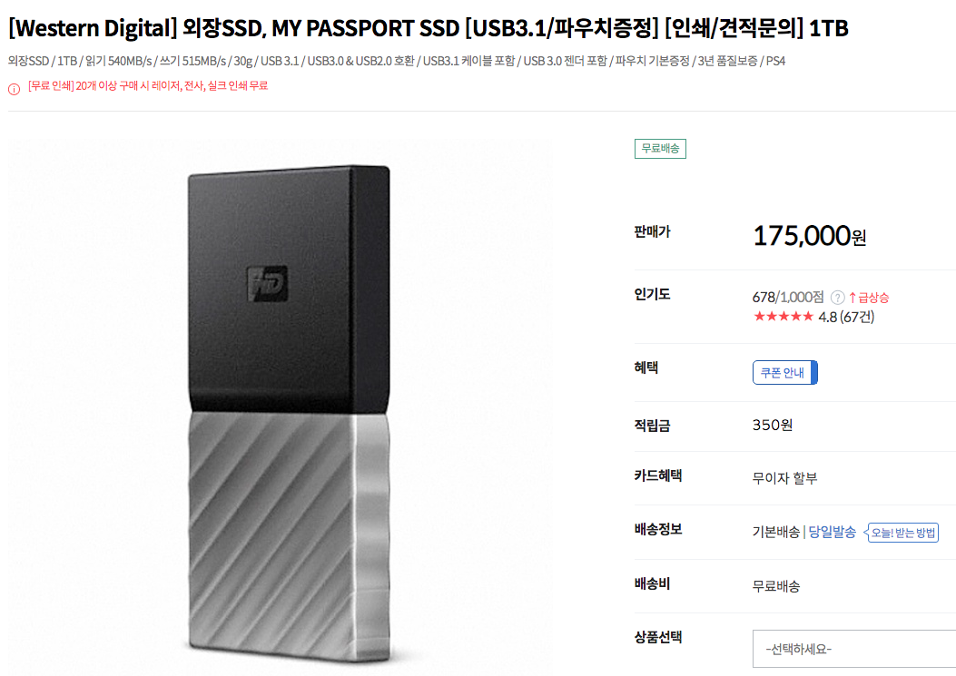 이 제품은 메모리를 사용자가 업그레이드 할 수 있는 모델. 무조건 기본 8GB 모델을 사고 메모리를 따로 구입하여 업그레이드하기로 하였다. 하드디스크는 2TB까지 갈 수 있지만 가격이 비싸 USB 3.1 SSD를 사서 외장으로 연결해 쓰기로 했다. 컴퓨존에서 16GB 메모리 SO-DIMM 2개(72070원*2)와 1TB 외장 SSD 한 개(175,000원)를 주문했다. 삼성 T5를 사고 싶었지만 이미 T5 1TB 모델은 며칠 만에 품절. 웨스턴디지털로 주문했다.