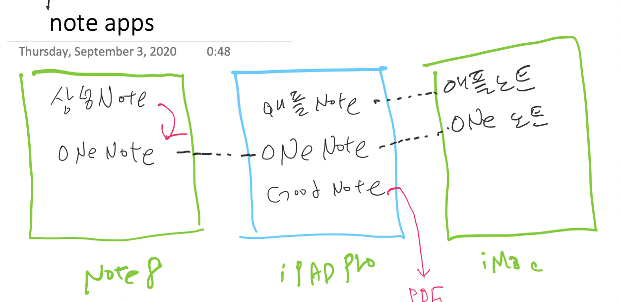 - 온라인용으로 애플 노트, 갤럭시 노트의 노트(펜입력), 구글 킵, 심지어 휴대폰 카메라를 사용했었는데 원노트로 통일!