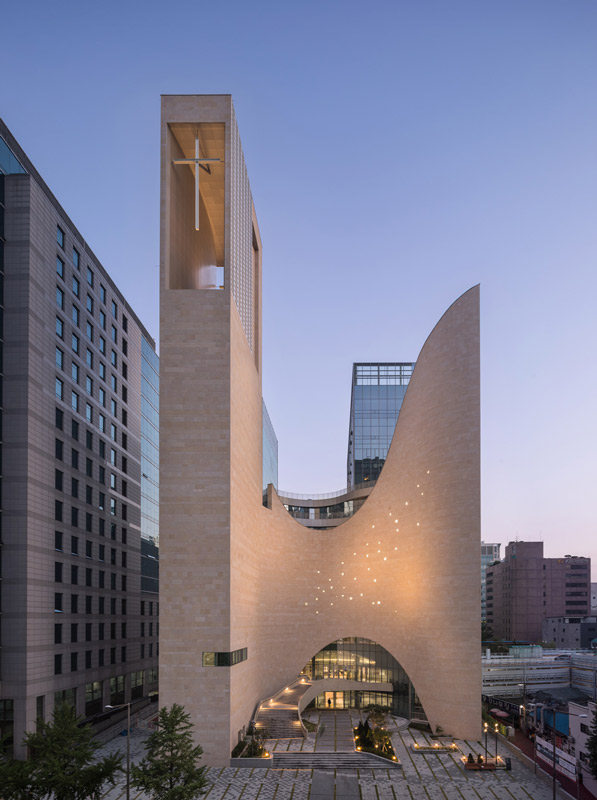 과거를 회상하는 로비층의 레거시 예배장소와 새로 지은 예배당은 전통과 새로움을 잘 연결하는 똑똑한 접근이고, 측면의 지원 공간은 타일? 혹은 유리로 만들되 곡면을 넣어 직육면체 광화문 오피스 빌딩 사이에서 눈에 띈다. 비싼 땅에 오피스 공간이나 임대 공간을 많이 만들지 않고 오롯이 교회 시설에 집중한 것도 잘했고, 일층 공간 상당 부분을 오픈한 것도 좋다. 하지만 오른쪽 곡면 부분 잘 시공할 수 있었을까.