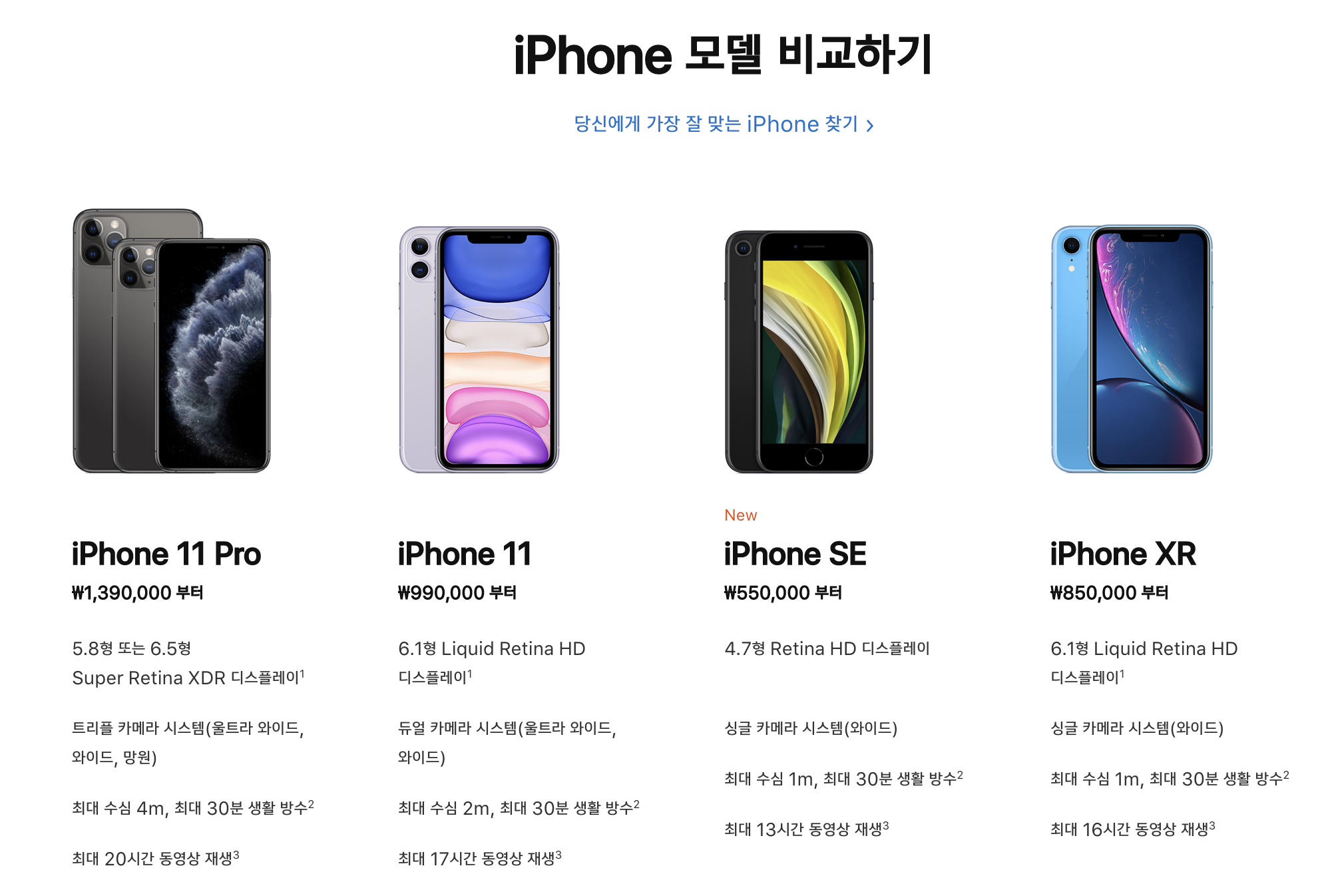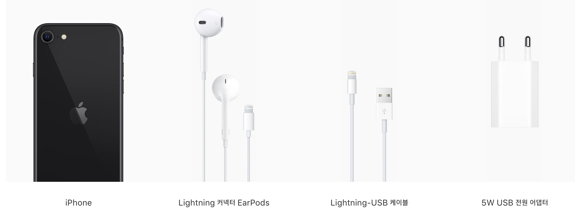 아이폰 가격 비교. 이미지 출처. 애플 홈페이지. (2020)아이폰SE 2 구성품. 이미치 출처. 애플 홈페이지. (2020)