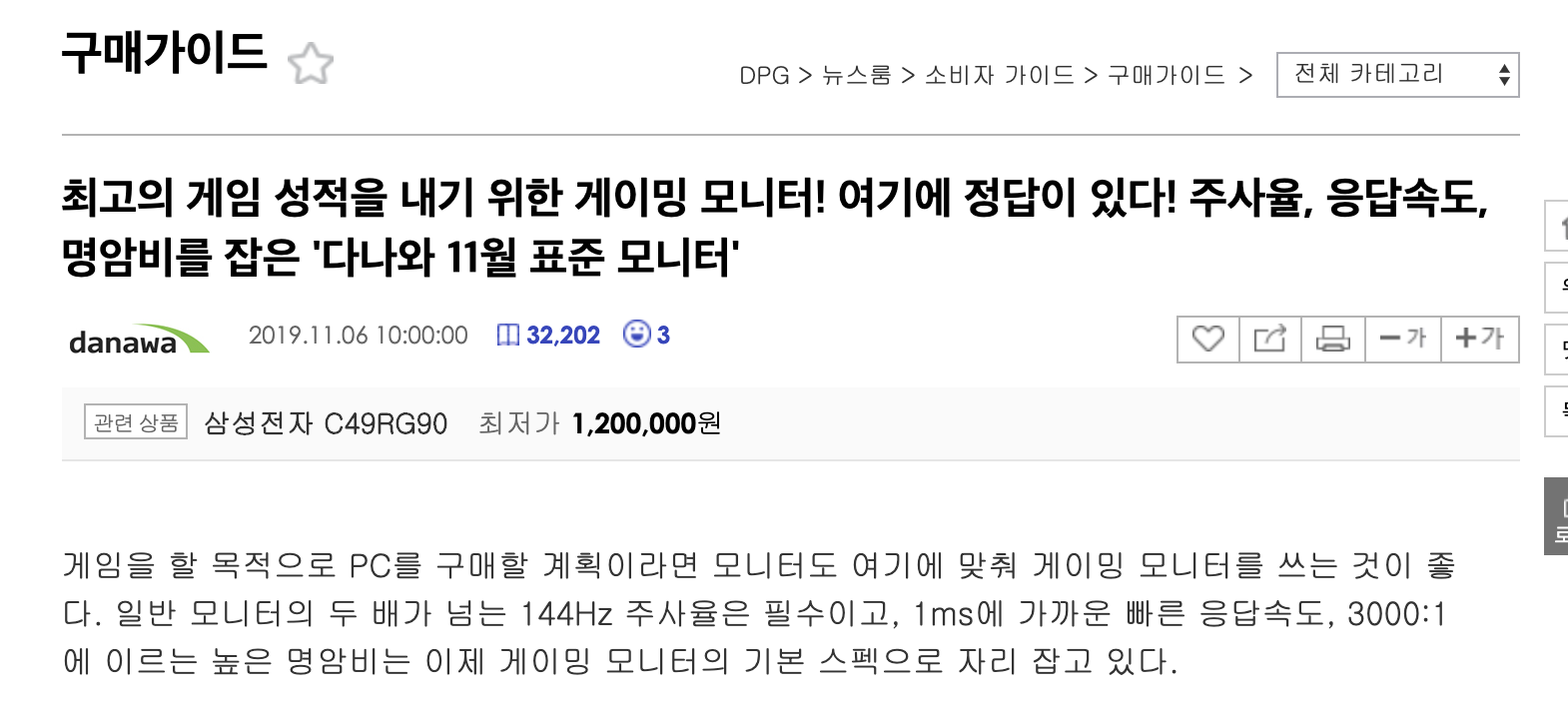 다나와 구매가이드에서는 게임용 모니터는 주사율 144Hz, 응답속도 1 ms 가 기본이라고 설득(?)중