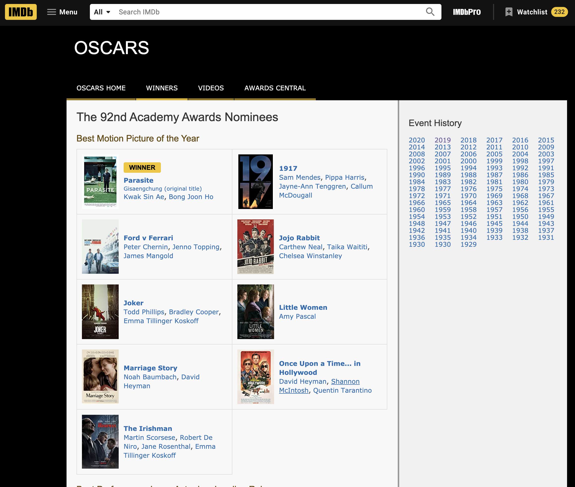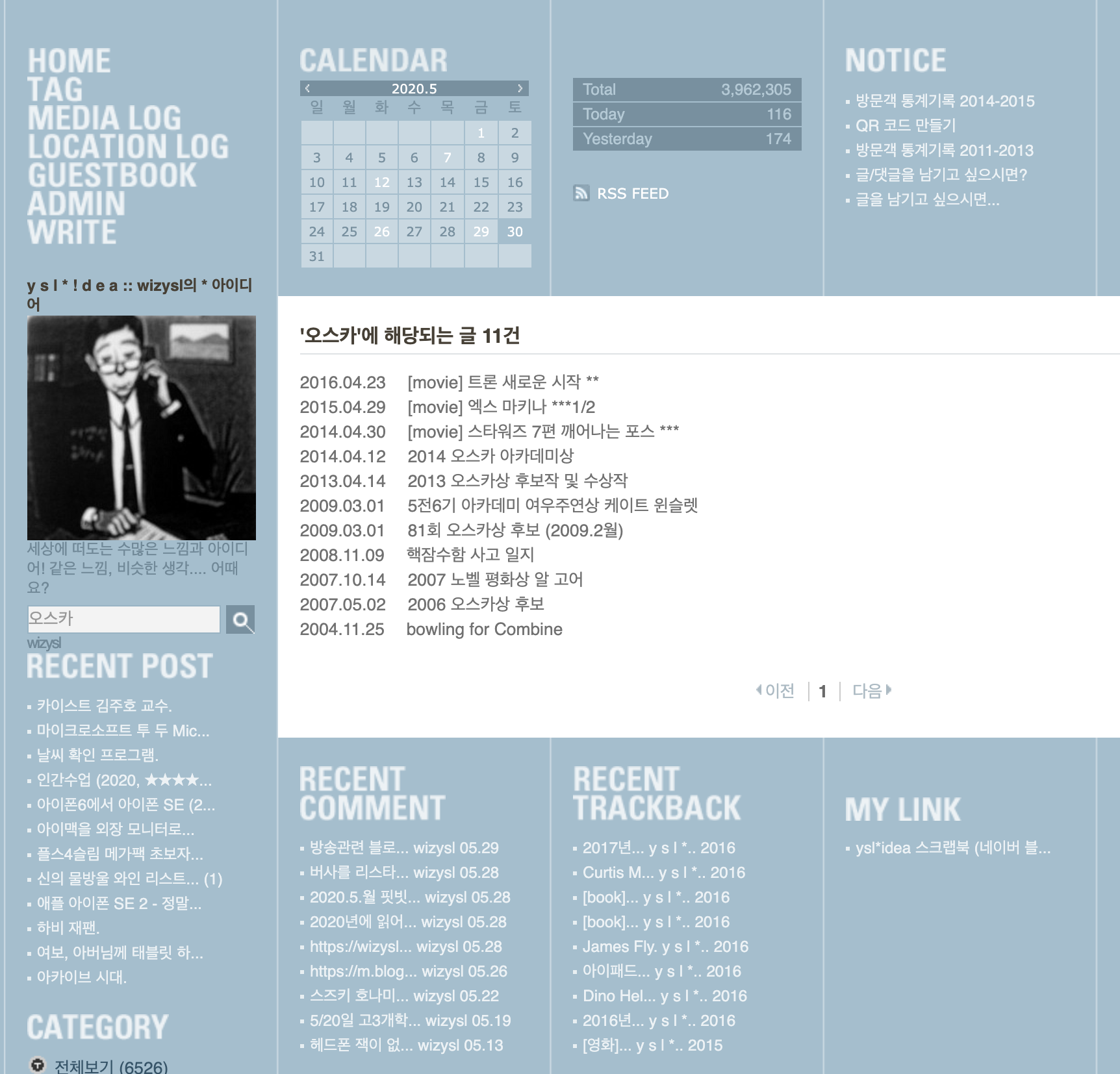 ysl!dea 블로그에서 오스카 수상작 업데이트 게을러진 더 큰 이유는 사실 따로 있다. 인터넷과 빅데이터가 나의 오스카 수상작 목록 컬렉션을 무색하게 만든 것이다. 가령 imdb.com 인터넷 무비 데이터베이스를 보자. 아예 수상작 페이지를 만들어 놓고 역대 수상작까지 깔끔하게 정리해 놓았다. 나 같은 수상작 목록 정리자에게는 하늘이 주신 선물! 언제부터 였을까? 몇십년 된 오스카 수상작 정리 노트를 조용히 창고에 보낼 때가 되었던 것이다.