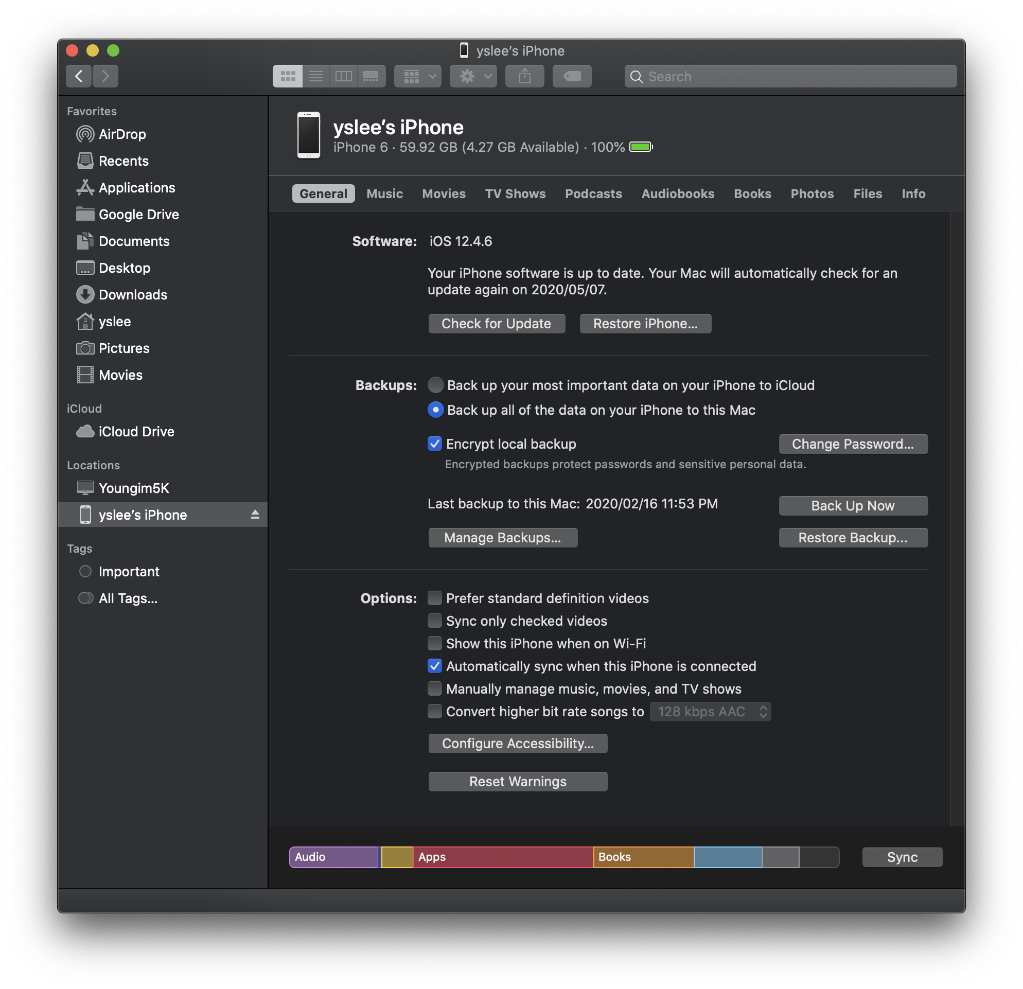 그리고 나서 아이폰 SE 2020을 연결하여 파인더에서 외부장치로 표시되는 새 아이폰을 골라 "Restore Backup..."을 통해 옛 아이폰6의 내용을 선택하니 잘 백업한다. 연락처, 사진, 캘린더, 등은 잘 넘어왔다. (예전에 아이클라우드로 복원시키다가 연락처가 2개씩 되는 바람에 고생한 것을 생각하면 지금도 등골아 오싹한다.) 물론 첫 작업이 끝나고 나서 자잘한 앱은 와이파이로 계속 다운받는다. 옛날 아이폰을 백업할 때 필요없는 앱은 지운 다음 백업하면 조금 시간을 절약할 수 있겠다.