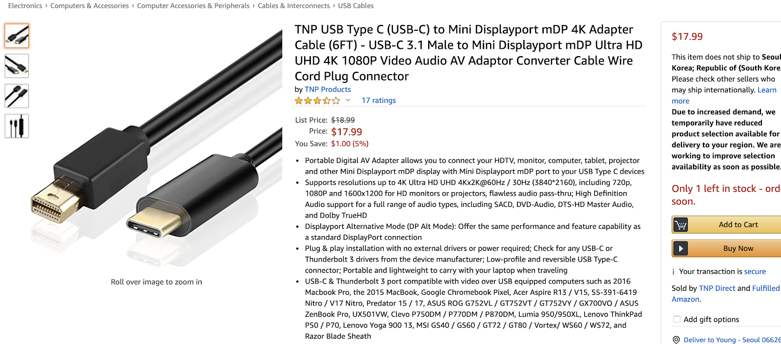 남은 것은 케이블 양끝이 한쪽은 MDP, 한쪽은 USB-C type thunderbolt 케이블을 사용해 보는 것. 애플 공홈의 공인 써드 파티 케이블(5만원+)을 써 보는 것일지. 이렇게 계속 투자하다보면 외장 모니터 하나 새로 살만한 돈을 어댑터와 케이블에 투자하고 있는 셈이다.