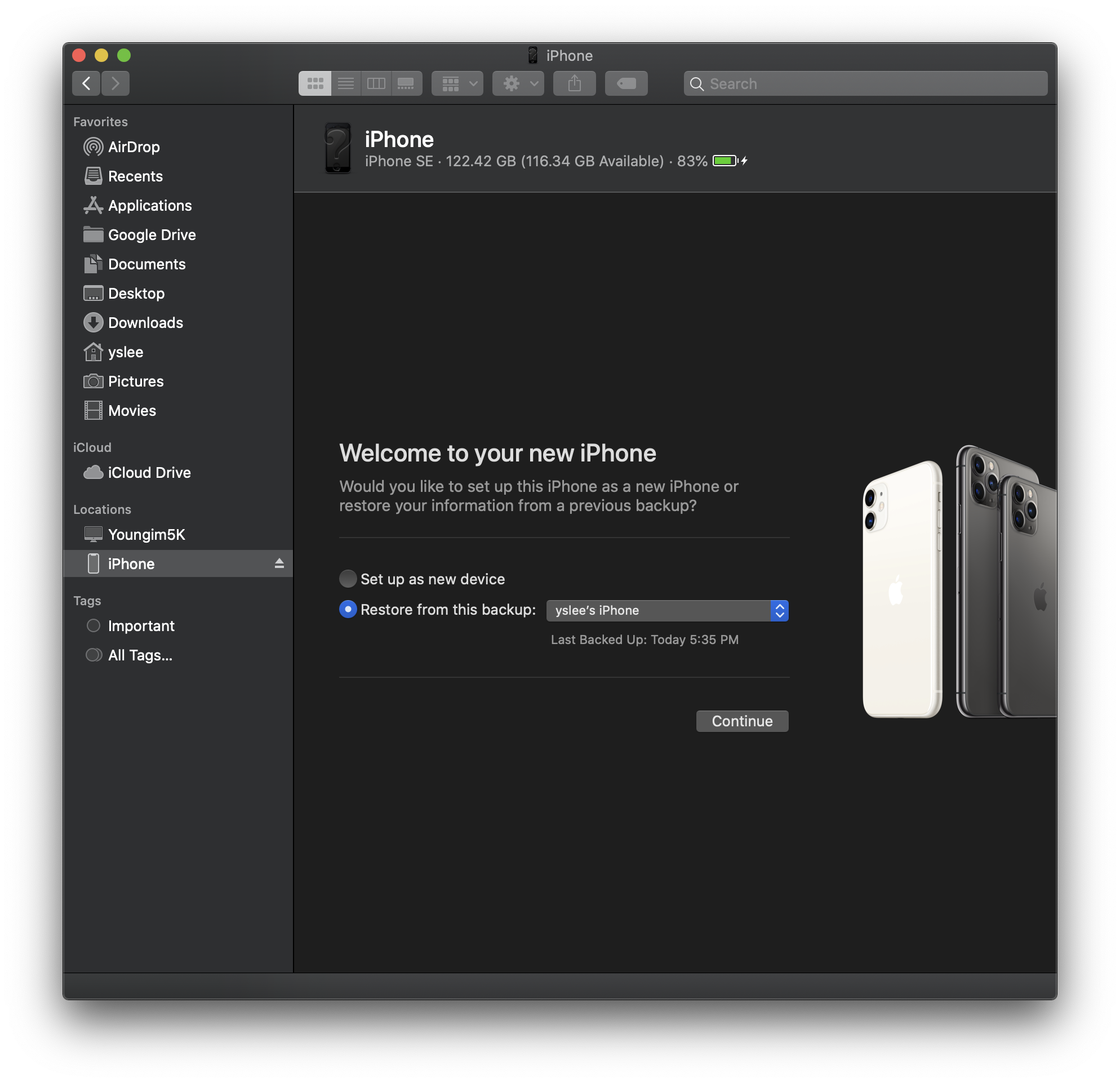 예전 폰을 아이맥에 USB 케이블로 연결하여 먼저 백업하고, 새 폰으로 복원하는 것이다. (그래도 아이클라우드 패스워드는 확인해 놓아야 한다.)